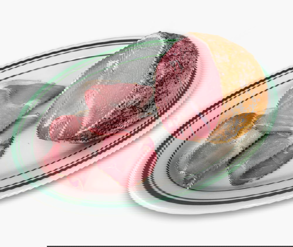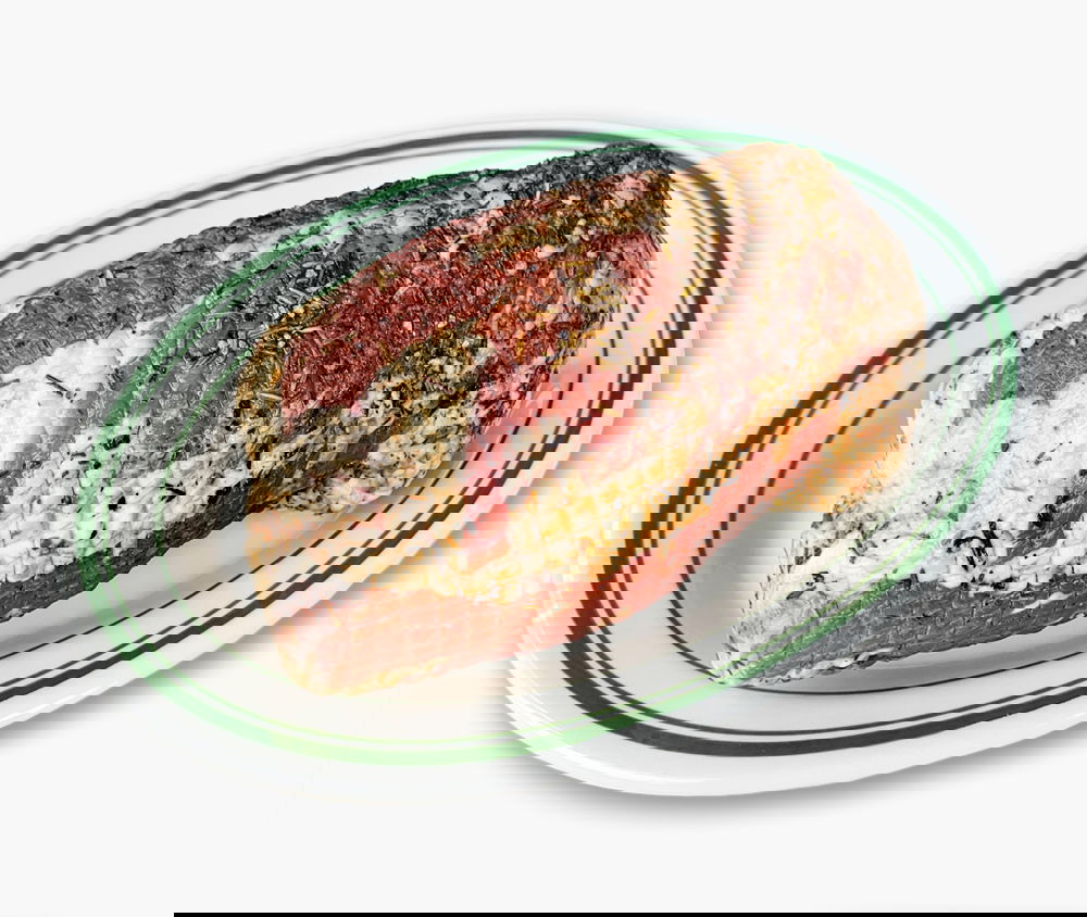 Licht gepekelde lamsbout, gekruid met tijm en rozemarijn, warm gerookt tot perfect rosé. Botermals en adembenemend lekker. Je kan een hele gerookte lamsbout als warm hoofdgerecht serveren. Wikkel de gerookte lamsbout in aluminiumfolie en leg in een oven voorverwarmd op 180C voor 30 minuten. De warme lamsbout is lekker met verse groenten zoals spinazie, tuinbonen geroosterde tomaten en ook met rozemarijn geroosterde aardappelen.