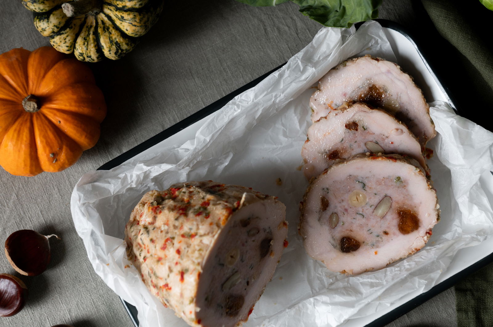 Gevulde kalkoenrollade hazelnoot abrikoos