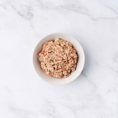 Ingrediënten: Wilde Alaska sockeye zalm, gerookte zalm (zalm, zout, gebufferde azijn, rook), mayonaise, rode ui, citroensap, bieslook, dille, zout, peper, conserveermiddel kaliumsorbaat.