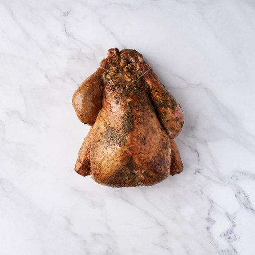 De gerookte gevulde kalkoen van Frank’s Smoke House is een feestelijke klassieker, volledig gegaard, eenvoudig op te warmen en 14 dagen houdbaar in de koelkast.